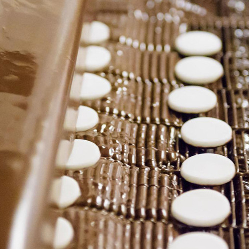 進入巧克力涂衣機的糖果被傳送到金屬絲網輸送機上,并從巧克力簾幕下通過;在金屬絲網輸送機下面有一個空的 V 形槽或帶輥的槽,以確保糖果底部的巧克力涂衣可控。從巧克力簾中流出的多余巧克力塊通過金屬絲網輸送機落入一個小型活動夾套巧克力缸中,然后再循環。對于純巧克力塊,也可以重新設計巧克力輸送管道,將其抽回巧克力脫晶設備或巧克力保溫箱,然后重新回爐,用于下一批生產。
