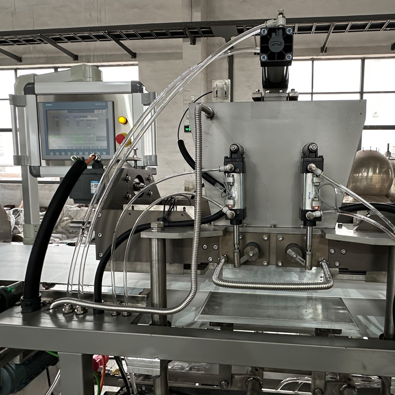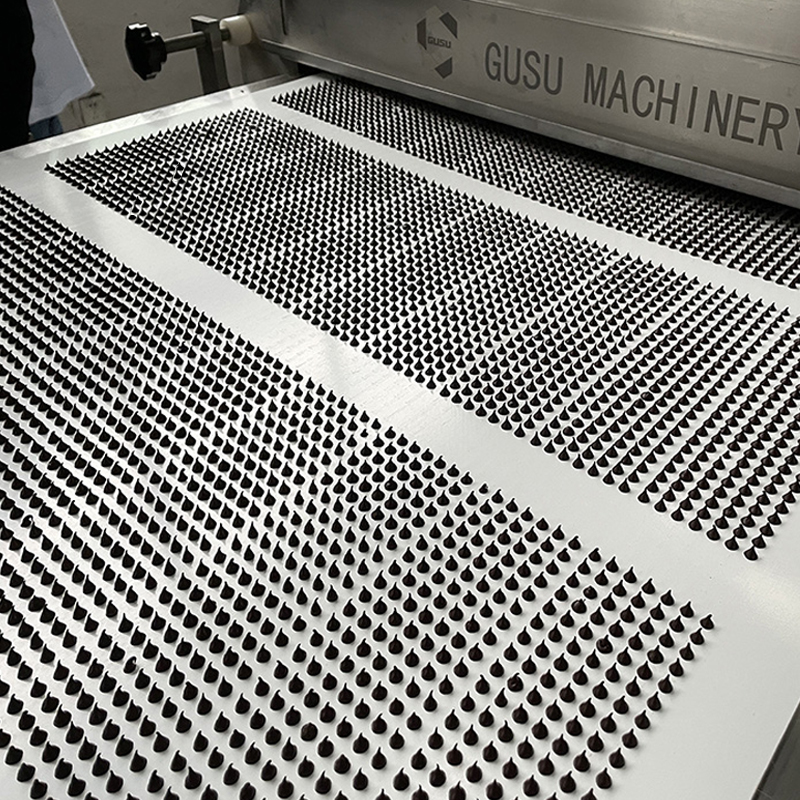 姑蘇機械QDJ系列巧克力滴澆機,主要用于生產(chǎn)頂部帶尾巴的小巧克力滴和巧克力幣。輸送帶底部有升降機構,使水滴狀巧克力拉出完美尾巴。巧克力滴澆機料斗下方安裝有一個大功率皮帶提升氣缸,其運動與冷卻隧道輸送機和滴澆工作相關,從而形成水滴狀巧克力和紐扣狀巧克力。